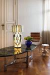 Each lamp begins as paper — laser cut and and then arranged by hand.Every piece is placed until each gold seam becomes a quiet line between color and light.